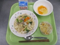 <今日の献立>・高野豆腐のそぼろ丼・たまごとコーンのスープ・菊花みかん・牛乳