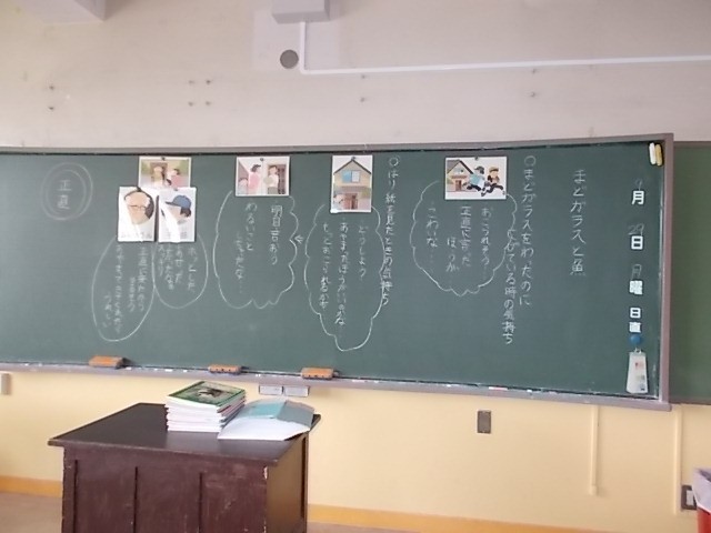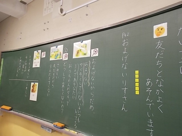 挿絵を黒板に貼ることによって、 話の流れを分かりやすく伝えることができます。