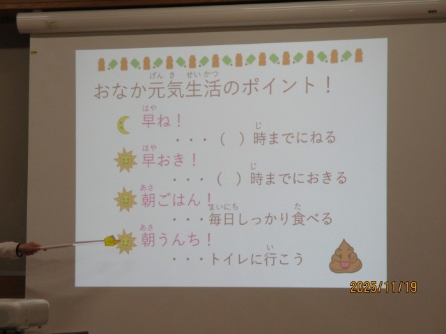 「早ね」「早おき」「朝ごはん」「朝うんち」の学習をしました。
