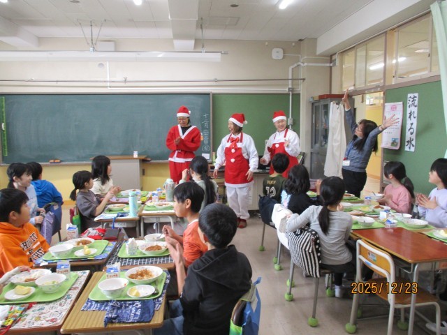 今年も、サンタ調理員さんが教室に来ました。サンタ帽をかぶった調理員さんが姿を見せると、いくつものクラスで拍手や歓声があがり、子どもたちの表情が一気に明るくなりました。
