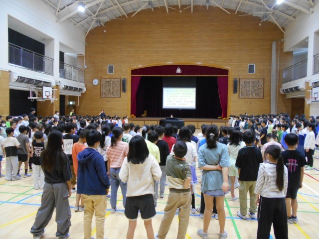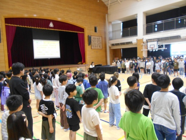 音楽朝会では、「校歌」と「はじめのいっぽ」を元気よく歌いました。