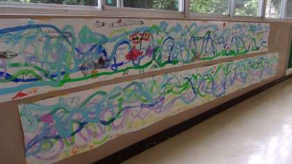2年生の図工の共同作品は、「線で遊ぼう 海が生まれたよ」です。
