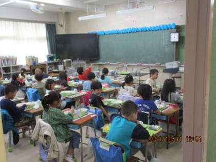 給食では、りっちゃんがサラダに入れた食材と同じ食材を使って作りました。そして、中根橋小の子供たちのために、何かいいこと、もっといいことができないかなと考えて、校長先生による『サラダで元気』の読み聞かせをすることにしました。子供たちは、サラダを食べながらお話を聞いていました。おいしく楽しく食べて午後も元気に過ごしていました。