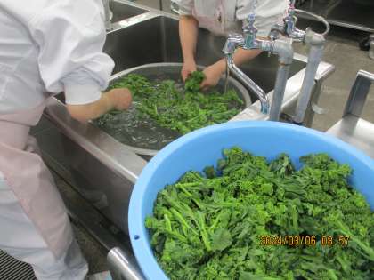 今日は菜の花ごはんでした。調理員さんは、菜の花の葉を一枚ずつ丁寧に洗っていました。季節の食材を、おいしい給食に仕上げてくれました。