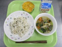 <今日の献立> ・ごまごはん ・鮭のちゃんちゃん焼き ・たまごのすまし汁 ・牛乳