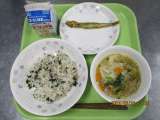<今日の献立> ・茎わかめ入り混ぜごはん ・ししゃものカレー焼き ・ワンタンスー...