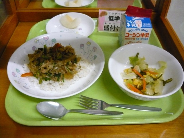 「プルコギ」は日本のお隣韓国の料理です。言葉の響きがかわいい名前ですね。韓国語で「プル」は「火」・「コギ」は「肉」という意味です。甘めのたれに漬けこんだ肉を野菜と一緒に鉄板で焼く料理です。今日はの給食も豚肉とたっぷりの野菜を炒めて、しょうゆやみそ、オイスターソースなどの調味料で味付けをして作りました。ごはんと一緒にもりもりいただきましょう。