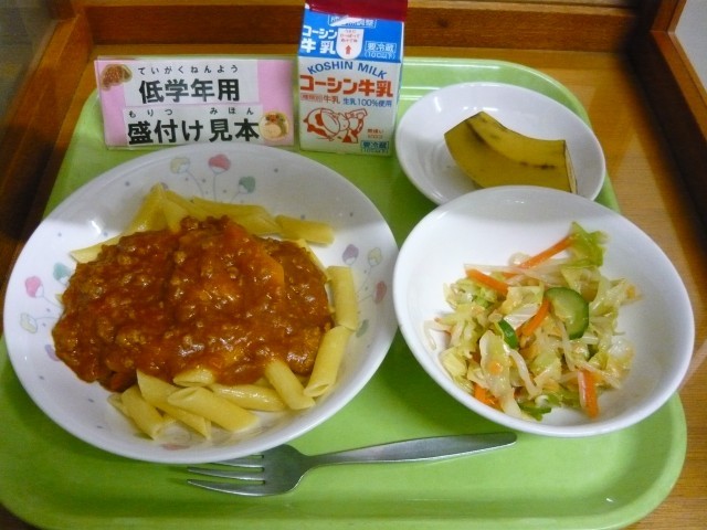 ボロネーゼは、ひき肉・にんいく・セロリ・玉ねぎ・トマトなどの野菜を炒めて煮込んだソースのことで、パスタと一緒に食べると美味しい料理です。イリアで生まれた料理で、本場では、平たく幅の広いパスタをよく使います。今日の給食では、パスタの仲間である、ペン先のような形の「ペンネ」を使います。肉や野菜と一緒に良く味わって食べましょう。
