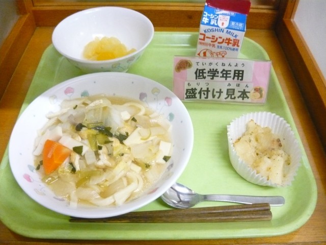 うどんは、奈良時代に中国から伝わりました。作り方は、小麦粉を食塩でこねて、うすくのばして細長く切ります。有名な郷土料理には、四国のさぬきうどん・名古屋のきしめん・山梨のほうとう・関東の鍋焼きうどんなどがあります。小麦粉と塩水で作っためんは、うどんのほかにもありますが、地域や太さによって呼び名も違います。うどんより少し細いのが「ひやむぎ」、ひやむぎより細いのが「そうめん」です。今日は、鶏肉・はくさい・にんじんなどの野菜も入った、具だくさんのあんかけうどんです。