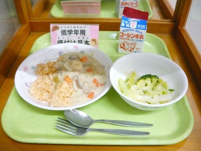 今日は、パプリカライスにえび入りホワイトソースをかけたクリームライスです。外国の料理のように見えますが、日本の学校給食で生まれた人気メニューです。いつもは、にんじんライスにしますが、にんじんはソースに入っています。にんじんは、根を食べる野菜の中で珍しく緑黄食野菜です。ビタミンAやカロテンが豊富な野菜です。