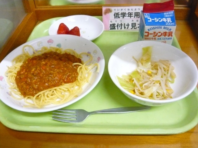 今日は、人気メニューの一つ「スパゲティミートソース」です。ミートソースが生まれたイタリアでは、「ボロネーゼ」という名前で呼ばれています。これは、この料理が生まれた「ボローニャ地方」から名付けられました。給食のミートソースも、調理員さんがじっくり時間をかけて作ってくれました。ソースはに、甘みをだすために、玉ねぎをよく炒めたり、トマト酸味が和らぐように、大きなへらでかき混ぜながらしっかり煮込んだり、美味しく仕上げるための手間が詰まっています。