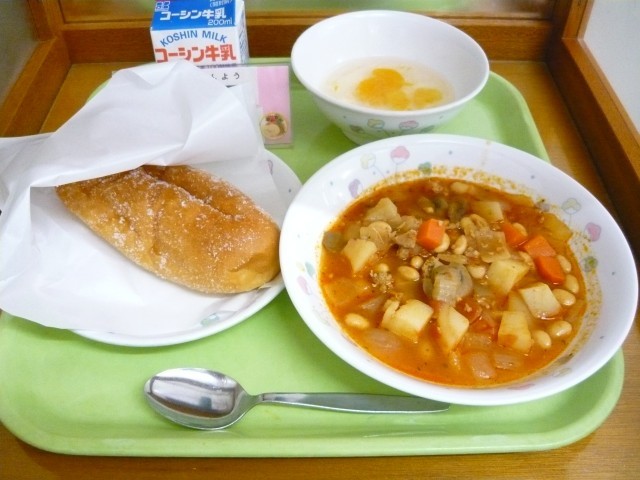 主食部門第2位「揚げパン」とデザート・くだもの部門第1位「サイダーポンチ」です。揚げパンは、パンを高温の油で揚げて表面をカリッとさせたてから、油をまぶしています。揚げパンセレクトでは、ココア味が人気でしたが、今日は「さとう味」です。フルーツミックスに、サイダーが入っているので、口の中でシュワッとはじけます。