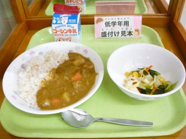 1年生の給食を、お手伝いにいきました。初めての給食準備や盛り付けでしたが、上手に給食当番ができていました。牛乳パックも、牛乳をこぼさずに、上手に開けていました。「カレー好きだから、全部たべた。」「好き嫌いないから、野菜も食べれるよ。」との声も聞こえてきました。また、給食の様子を見にいきたいと思います。