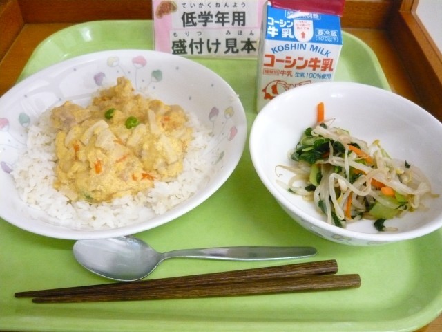 親子丼は、鶏肉と卵を使う料理で、親と子(鶏肉と鶏から生まれる卵)の両方の食材を使うことから「親子丼」という名前がつきました。出汁で、鶏にくとにんじん・玉ねぎを煮て、醤油と砂糖で味付けし、全体をかき混ぜながら卵を流しいれて、最後に緑色のみつばを加えます。お店や家庭では、卵を半熟で仕上げて食べるのもおいしいですが、給食では、安全のため卵もしっかり加熱して作っています。今日は、変わり親子丼ということで、高野豆腐が入っています。