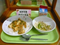 親子丼という名前は、にわとりの肉と、にわとりの卵を使うことから「親子丼」とつけられました。鶏肉や玉ねぎを卵でとじ、ごはんの上にのせる料理です。給食でも、ごはんと一緒にして食べてください。