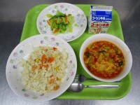 ・牛乳・コーンピラフ・最上町産アスパラのサラダ・トマトとたまごのスープ 食材 (...