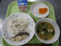 牛乳磯おこわきびなごのから揚げかきたま汁にんじん(静岡産)しょうが(高知産)長ねぎ(千葉産)はくさい(茨城産)えのき(長野産)こまつな(埼玉産)とり肉(岩手産)きびなご(鹿児島産)