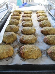 たれをかけます。給食室では440個くらいハンバーグを作りました。