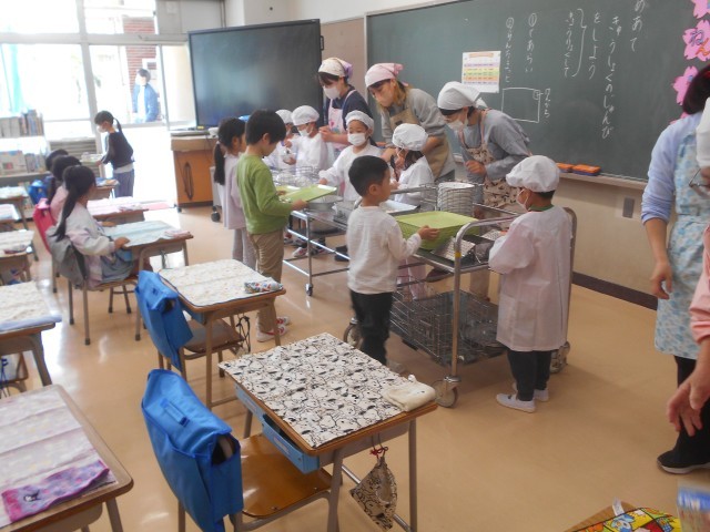 教室に食欲をそそる良い香りが漂ってきました。1年生にとって大きな挑戦のひとつである「給食」のスタートです。