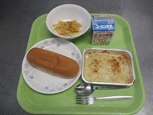 令和4年1月28日(金) 公開日 2022/01/31 更新日 2022/01/31 給食献立 ◇牛乳 ◇黒砂糖パンコッペ ◇ポテトグラタン ◇コーンと野菜のサラダ ・人参・・・千葉県 ・じゃが芋・鹿児島県 ・キャベツ・愛知県 ・玉葱・・・北海道 ・鶏肉・・・宮崎県