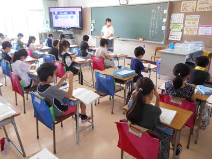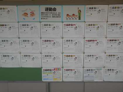 2日(木)の国語は、「大事なことを落とさずに、メモをとりながら話しを聞くための方法を考える」という授業でした。視聴資料から聞き取ったことをメモして、自分のメモと、お手本のメモとを比べ、メモの方法のポイントを学びました。廊下掲示は運動会の頑張りや印象に残ったことをまとめた作品です。
