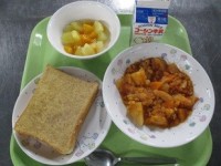 今日の給食は、ごぼう入りドライカレー・お楽しみデザートです。