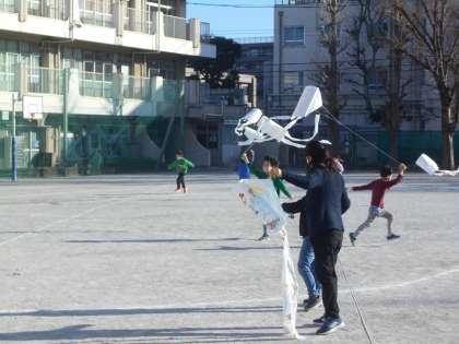 26日(木)に1年生は、先週の土曜授業プランで作成し完成した「たこ」を、校庭で上げる活動をしました。寒さに負けず、高く舞い上がらせようと走り回っていました。
