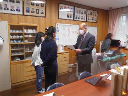 13日(月)の全校朝会はリモートで行いました。1月に開催された書き初め展の表彰です。
