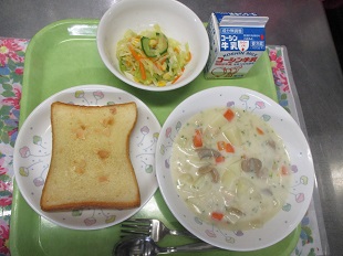 アーモンドは、桜によく似た花が咲き、梅の実のような実をつけます。その実の中の、硬い種の中にある「仁」という軟らかいところが、私たちが食べているところです。アーモンドには、血液の流れをよくしてくれる働きがあるビタミンEや食物繊維などたくさん含まれています。今日は、マーガリンに粉末のアーモンドと砂糖を混ぜてパンにぬり、トーストにしました。トッピングにスライスしたアーモンドも使っています。よくかんで食べましょう。コールスローサラダは、細かく切ったキャベツを使ったサラダです。キャベツはみじん切りだったり、千切りだったりします。また、キャベツの他に人参やパイナップル、りんごなどの果物が入っていることもあります。オランダ語で、「コール」は「キャベツ」の意味。「スロー」は「サラダ」の意味です。キャベツには、風邪の予防になるビタミンもたくさん含まれています。
