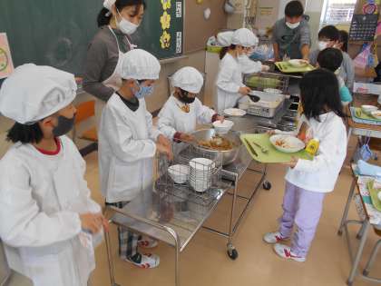 11日(火)は1年生にとって、初めての給食の日でした。メニューは、ごはん、豆腐の中華煮、バンサンスウ、牛乳でした。ほとんどの子が完食し、おかわりをする子もいました。
