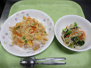 令和6年3月13日(水) 公開日 2024/03/14 更新日 2024/03/14 給食献立 ◇牛乳 ◇変わり親子丼 ◇野菜のからし和え ・玉ねぎ・・・北海道 ・にんじん・・千葉県 ・もやし・・・栃木県 ・青菜・・・・茨城県 ・しょうが・・高知県 ・とり肉・・・宮崎県 ・たまご・・・青森県