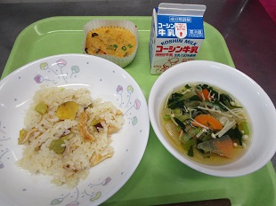 2020年 10月12日(月) 公開日 2020/10/12 更新日 2020/10/12 給食献立 ◆牛乳 ◆栗おこわ ◆擬制豆腐 ◆すまし汁 ・鶏肉・・・・宮崎県 ・にんじん・・北海道 ・玉ねぎ・・・北海道 ・さつまいも・千葉県 ・長ねぎ・・・青森県 ・いんげん・・福島県 ・えのきたけ・長野県 ・大根・・・・北海道 ・しょうが・・高知県 ・青菜・・・・埼玉県