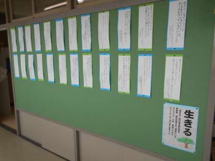 14日(金)は6年2組の理科の時間です。食べ物が体の中でどのようにすすんで養分になっていくのかを考えました。はじめに人体の輪郭に自分の予想を書き込みました。その後に、動画を視聴し、食べ物の行方を映像で確かめました。最後に、「胃」「腸」「消化液」などのキーワードを押さえながらプリントにまとめました。廊下には、国語科で詩「生きる」を学習した後、自分が生きていると実感することを書き出し、短冊にして掲示しました。