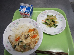 令和3年5月20日(木) 公開日 2021/05/21 更新日 2021/05/21 給食献立 ◆牛乳 ◆ごはん ◆四川豆腐 ◆切り干し大根入りサラダ ・生姜・・・・高知県 ・にんじん・・徳島県 ・ニンニク・・青森県 ・ニラ・・・・千葉県 ・長ネギ・・・茨城県 ・キャベツ・・愛知県 ・きゅうり・・埼玉県 ・豚肉・・・・青森県