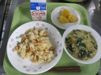 <あまつっこ給食>牛乳わかめごはんひじきの春巻きワンタンスープ今日は天津わかしお...