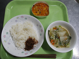 牛乳 ごはん おかかふりかけ あんかけ卵焼き かぶのみそ汁 たまねぎ・・・北...