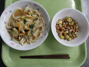 牛乳 駒ヶ根産しめじ入り卵とじうどん 青のりビーンズポテト たまねぎ・・・・...