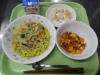 <CS委員須藤さんが選んだ献立>牛乳みそバターラーメン大豆とポテトのフライフルーツヨーグルトかけにんにく(青森産)しょうが(高知産)たまねぎ(北海道産)にんじん(北海道産)もやし(栃木産)はくさい(長...