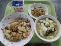 牛乳菜飯さわらのしょうが風味焼き豆乳仕立ての野菜汁こまつな(埼玉産)しょうが(高知産)長ねぎ(青森産)にんじん(北海道産)だいこん(青森産)はくさい(長野産)じゃがいも(北海道産)