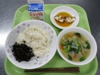 牛乳ゆかりごはんツナ入り卵焼きみそ汁清見オレンジたまねぎ(北海道産)じゃがいも(鹿児島産)にんじん(千葉産)もやし(栃木産)えのき(長野産)長ねぎ(千葉産)あおな(茨城産)清見オレンジ(愛媛産)