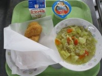 牛乳コーンライスクリスピーフィッシュ野菜スープにんにく(青森産)しょうが(高知産)たまねぎ(北海道産)にんじん(千葉産)じゃがいも(北海道産)はくさい(茨城産)