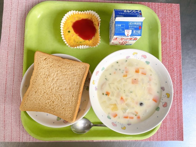 黒砂糖パン、スパニッシュオムレツ、サーモンチャウダー、牛乳