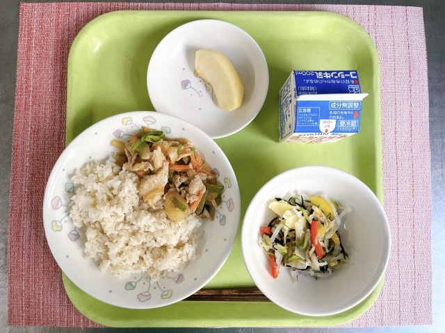 ごはん、チンジャオロース、ひじきとパプリカのサラダ、りんご、牛乳