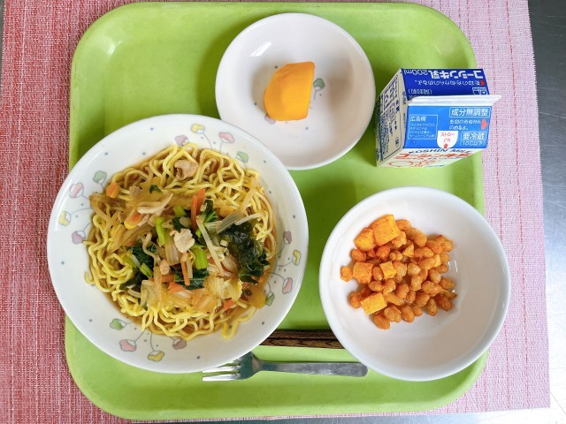 みそラーメン、大豆とポテトのフライ、柿、牛乳