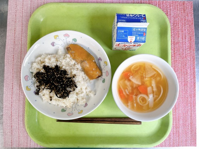ごはん、ひじきふりかけ、魚(ブリ)の味噌だれがけ、吉野汁、牛乳
