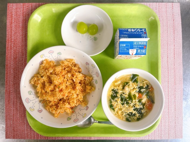 キムチチャーハン、卵と春雨のスープ、シャインマスカット、牛乳