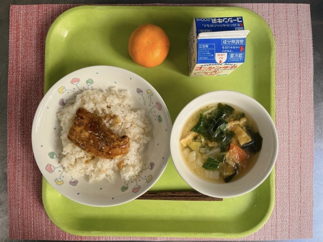 秋刀魚の蒲焼き丼、みそ汁、みかん、牛乳