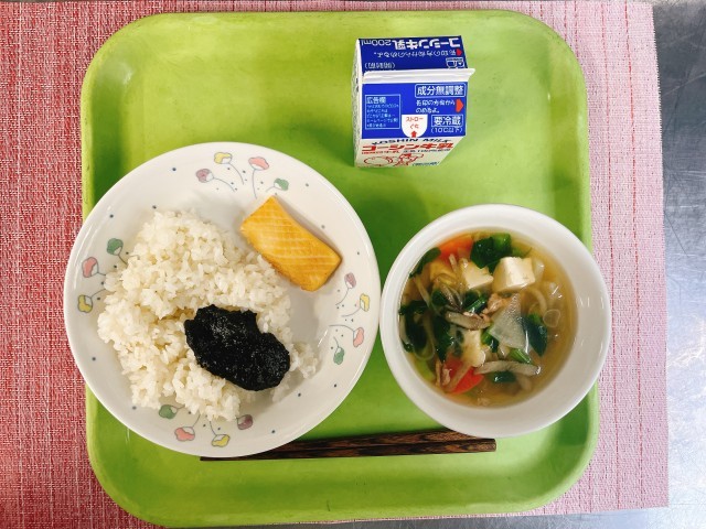 山形県産新米ごはん、いかの松笠焼き、のりの佃煮、けんちん汁、牛乳