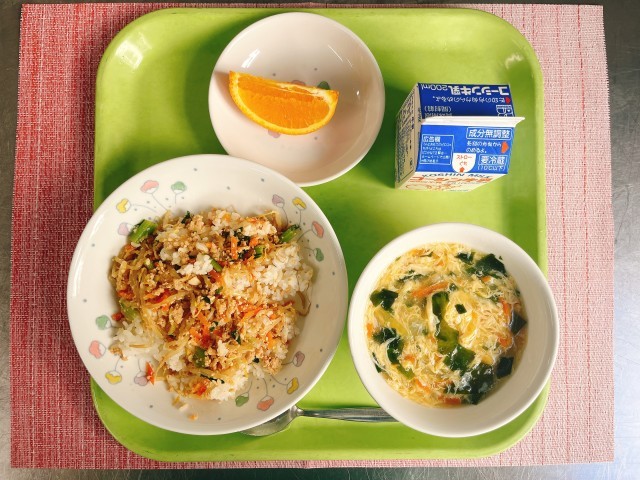 ビビンバ風混ぜご飯、卵スープ、オレンジ、牛乳