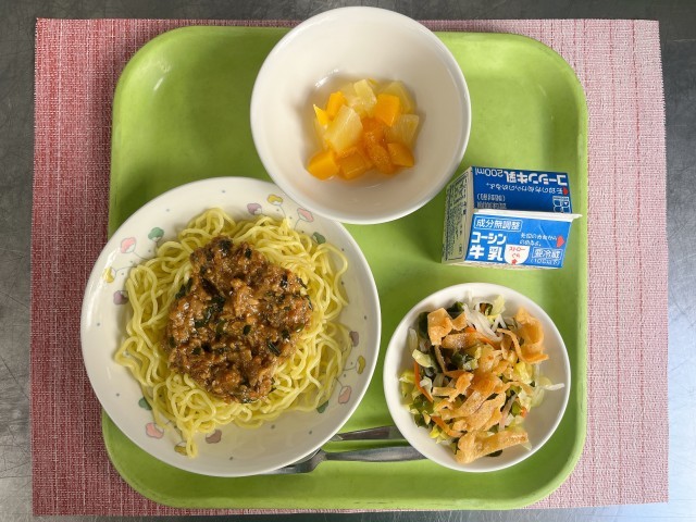 ジャージャン麺、カリパリサラダ、サイダーポンチ、牛乳